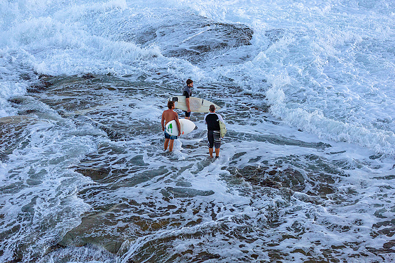 Saturday’s surf conditions were pretty average, some of the local surf breaks like Avoca were flat, lifeless and surferless as well. Then you head to Terrigal and off the rocks it is a totally different story. Huge walls of water coming through, brown foam, the Terrigal rockshelf looked more like Somersby Falls after a downpour and a ton of morning surfers looking for a spot. Aside from trying to catch a wave you first had to get out of there, watched many a surfer look at launching off the rocks and then wisely deciding not too. The guys in the top shot pondered for a good 10 minutes and then turned back and found another way out. Good move. !!
