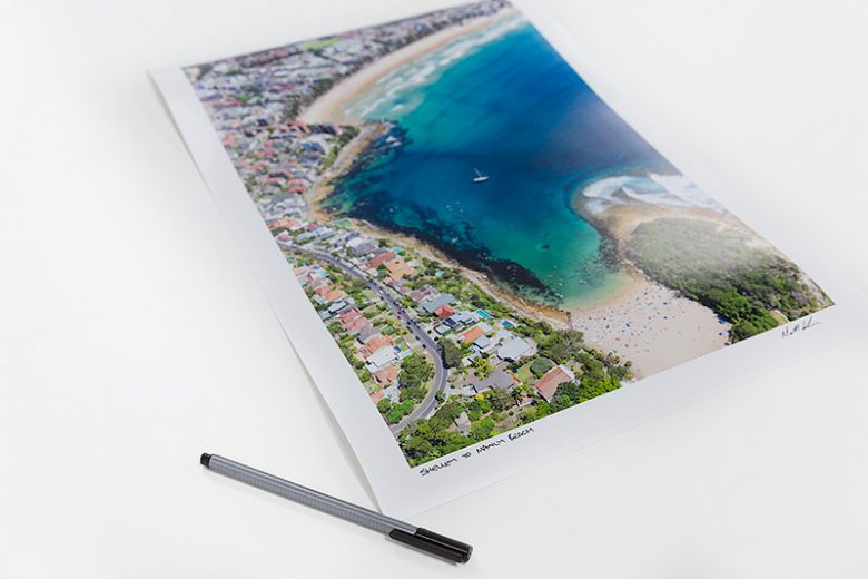 A 18 x 12 inch wide (45cm x 30cm) aerial photo of Shelley to Manly Beach. Hand titled and signed by Matt.