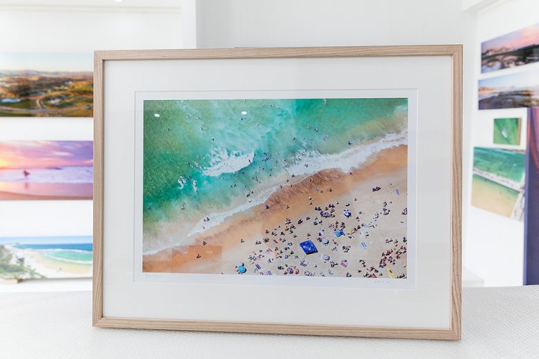 An 18 x 12 inch wide (45cm x 30cm) aerial photo of Bar Beach in Newcastle. Printed on Kodak Metallic paper and finished in a RAW Tasmanian Oak.