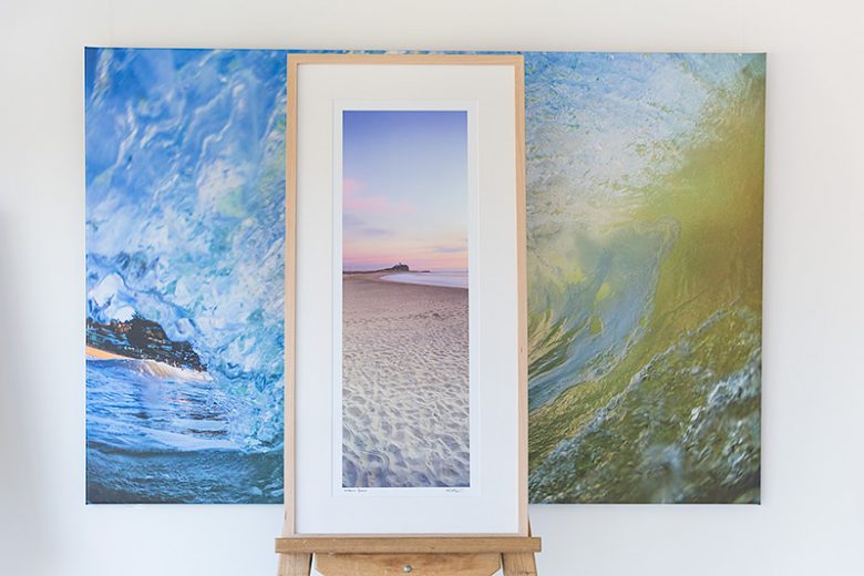 A 30 x 10 inch wide (75cm x 25cm) vertical photo of Nobbys Beach. Printed on our Kodak Metallic paper and framed in a RAW Tasmanian oak frame.