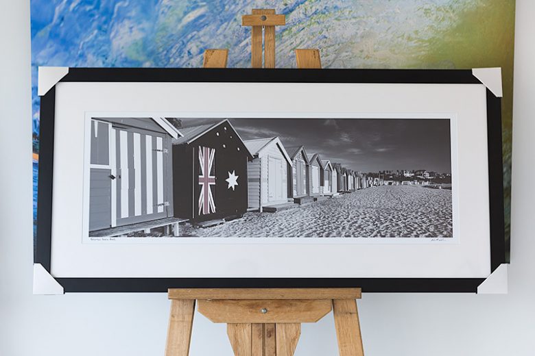 A 40 inch wide (101cm x 33cm) photo of Brighton Beaches boxes in Black and White. Printed on Kodak Metallic paper and finished in a Black frame.