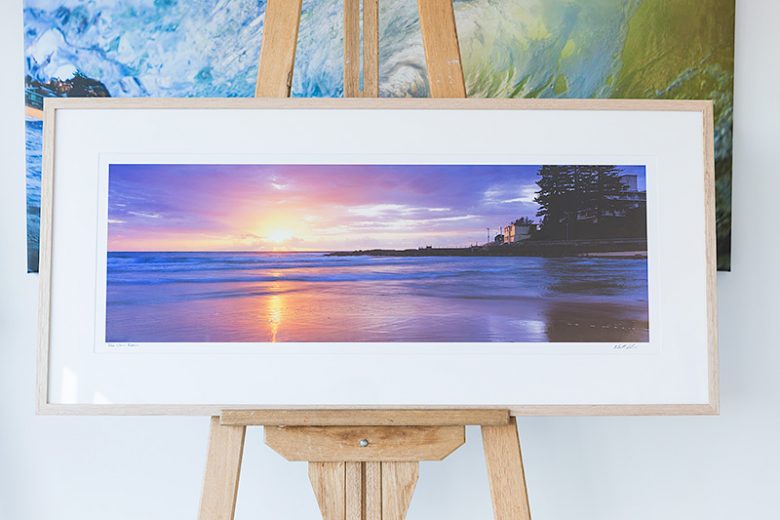 A 40 inch wide (101cm x 33cm) photo of Dee Why Beach on sunrise looking towards the ocean baths. Finished in our RAW Tasmanian Oak frame.