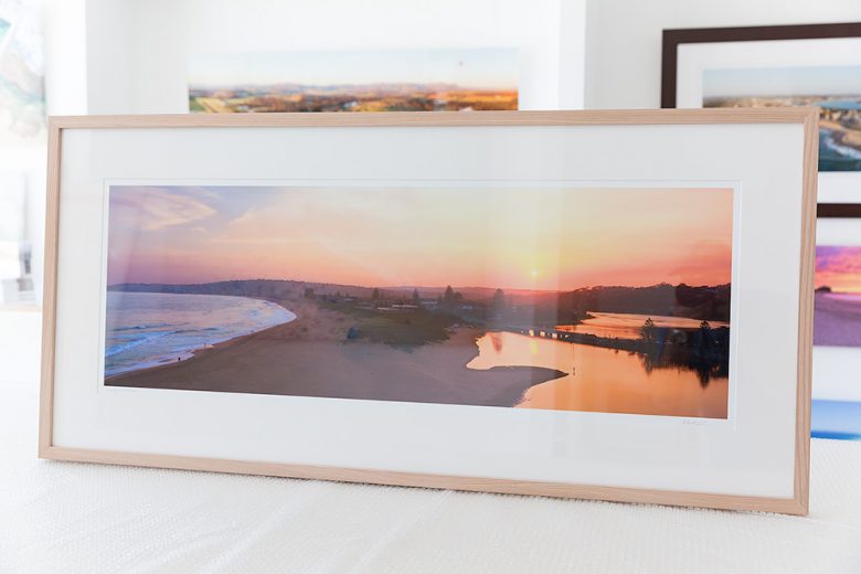 A 40 inch wide (100cm x 33cm) photo of Narrabeen Beach on sunset with the sun passing through bushfire smoke. Finished in our RAW Tasmanian Oak frame.