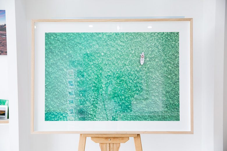 A 60 x 40 inch wide (150cm x 101cm) aerial photo of a Paddleboarder in Bondi. Printed on the Kodak Metallic paper, mounted to Aluminium, acrylic instead of glass for safety. Looks stunning, no photo does this justice. Finished in our RAW Tasmanian Oak frame.
