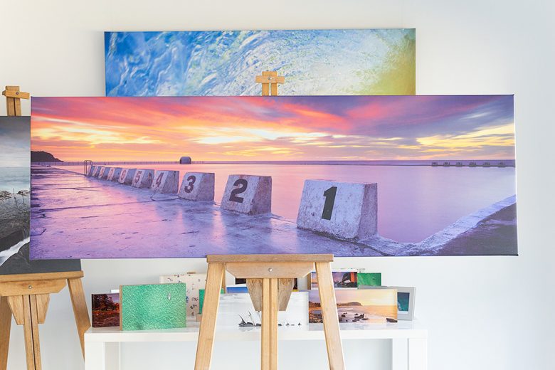 A 70 inch wide (177cm x 56cm) photo of Merewether Ocean Baths on sunrise, printed on our premium canvas and stretched ready to hang.
