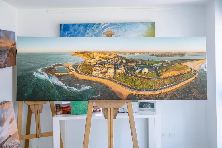 This 203 cm wide (80 inch) stretched canvas of Newcastle on sunrise. Packed and shipped to Newcastle for a local business waiting room. Image code NEW321.
