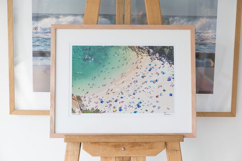 An 18 x 12 inch wide (60cm x 40cm) aerial photo of Shelley Beach on Sydney’s Northern Beaches. Printed on Kodak Metallic paper and finished in our Tasmanian Oak Frame.